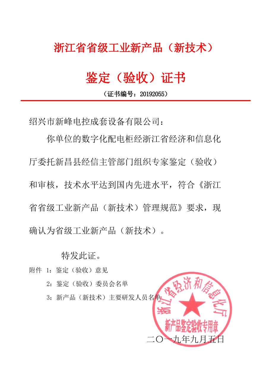 數(shù)字化配電柜 20192055-新產(chǎn)品科技證書